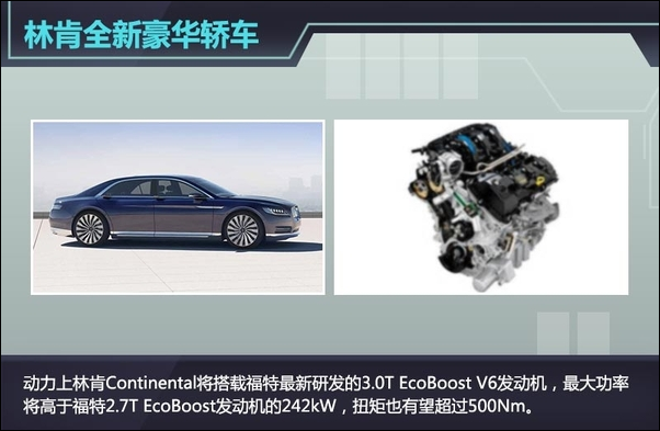 动力上林肯Continental将搭载福特最新研发的3.0T EcoBoost V6发动机,最大功率将高于福特2.7T EcoBoost发动机的242kW,扭矩也有望超过500Nm。传动部分,林肯“大陆”有望匹配9速自动变速箱。