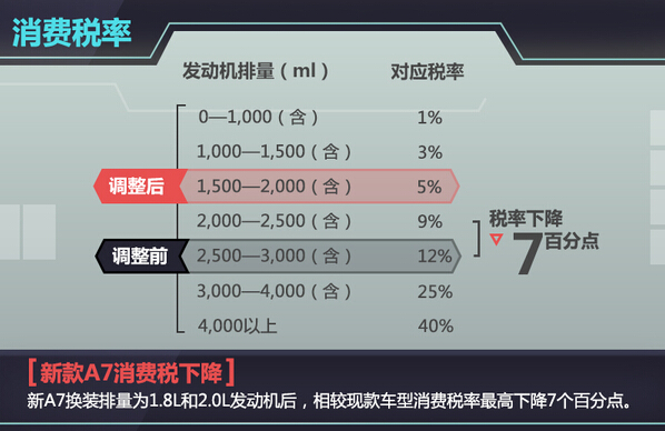 在动力方面,新款A7除搭载3.0L机械增压发动机外,还将新增1.8T和2.0T两款涡轮增压发动机,以取代现款车型所采用的2.5L和2.8L两款自然吸气发动机,并与之匹配了7速双离合变速器。动力配置的改变除将进一步提升新款A7的燃油经济性外,由于排量的下降还将使新车型所需缴纳的消费税有所降低。