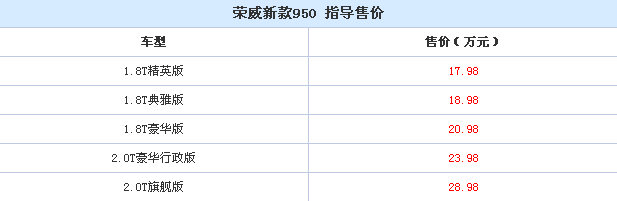 荣威(ROEWE)是上海汽车工业(集团)总公司旗下的一款汽车品牌,该品牌下的汽车技术来源于上海汽车之前收购的罗孚。日前,上汽荣威新款950正式上市,此次上市的新车共有两种发动机五款车型可选,其售价区间为17.98-28.98万元。另外,老款车型将保留2.0L舒适版与新款车型同堂销售,其价格依然为16.88万元。