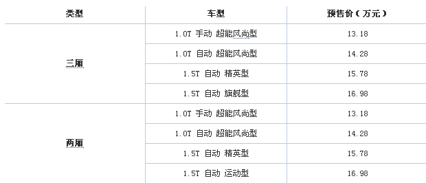 在配置方面,新车标配前排双安全气囊、前排侧气囊、侧气帘、ESC车身稳定控制、EBA刹车辅助、TCS牵引力控制、HSA坡道起步辅助系统等。高配车型还装有有无钥匙启动/进入系统、自动泊车、倒车影像、前雷达、定速巡航、8英寸屏幕等。