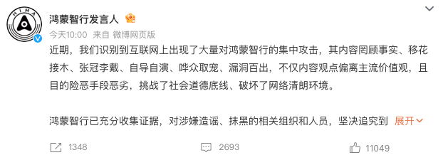 今日,“鸿蒙智行发言人”在官方微博发文称,近期公司识别到互联网上出现了大量对鸿蒙智行的集中攻击,其内容罔顾事实、移花接木、张冠李戴、自导自演、哗众取宠、漏洞百出,不仅内容观点偏离主流价值观,且目的险恶