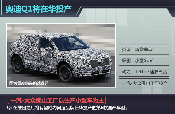 不久前奥迪官方表示,该品牌在华国产车型数量将增至6款,除目前在售的A3、A4L、A6L、Q3、Q5这五款外,还将新增一款国产车型。对于未来奥迪这款新增的国产车型,此前网通社曾从一汽-大众奥迪佛山工厂相关负责人了解到,一汽-大众佛山工厂主要还是以生产小型车为主,像奥迪A3、Q1等。由此不难发现,全新小型SUV奥迪Q1在推出之后将有望成为奥迪品牌在华投产的第6款国产车型。据悉,奥迪Q1将在明年正式发布,并有望在明年第四季度实现海外市场的投放,而针对于中国市场的国产Q1也将随即在华上市。