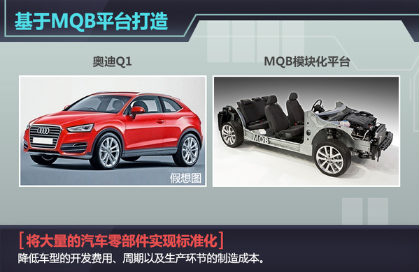 奥迪Q1与A3和TT一样基于大众集团的MQB平台进行开发。MQB平台的研发借鉴了大众集团多个新平台的研发成果,成为横置发动机车型研发制造模式的转折点。这一模块化平台将大量的汽车零部件实现标准化,令它们可以在不同品牌和不同级别的车型中实现共享。所以,这一技术的应用将极大地降低车型的开发费用、周期以及生产环节的制造成本。