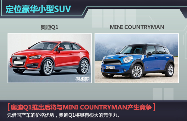 作为一款豪华小型SUV,奥迪Q1上市后将与同级别的MINI COUNTRYMAN进行竞争。在中国市场当中,定位于豪华小型SUV这一细分领域的车型屈指可数。凭借国产车的价格优势,奥迪Q1将具有很大的竞争力。另外,目前奥迪品牌SUV产品线中,Q3、Q5以及Q7车型已经包揽了从紧凑至中大型各个细分领域,到2016年Q1的推出无疑将使奥迪品牌在SUV领域实现更大范围的产品覆盖。